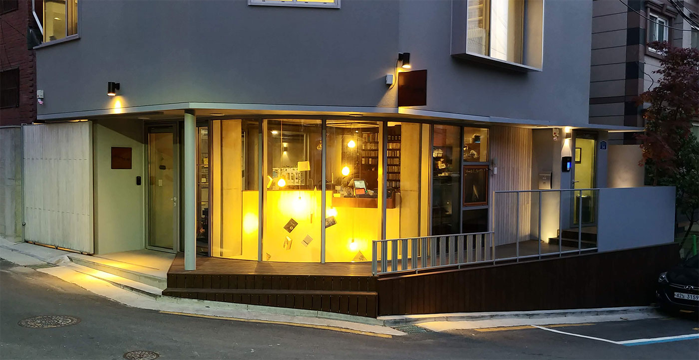 지하서재가 입주한 건물의 대지는 30평(100㎡)이 되지 않습니다. 흔히 말하는 ‘협소 건물’의 범주에 들어갈 수 있습니다. 2016년 12월 설계를 시작한 지하서재 건물은 2017년 9월 공사를 시작하여 2018년 5월 완공하였습니다. 지하 1층부터 지상 4층으로 지은 건물 전체의 설계는 솔토지빈건축사사무소의 조남호 건축가와 조예린 건축가가 담당하였습니다. 지하서재는 건물 내부에서 1층과 지하의 아담한 공간을 차지하고 있습니다. 지하서재 내부의 공간 설계와 인테리어는 김영진 대표의 디자인펌에서 진행하였습니다.